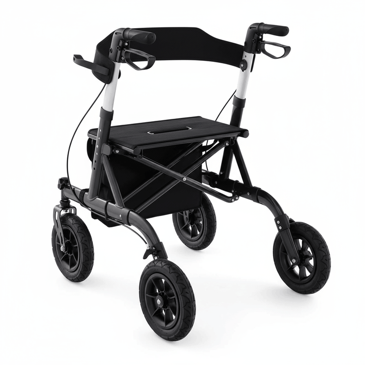 Built with 9.5" all-terrain pneumatic wheels, a lightweight 18 lb aluminum frame, and a padded seat for resting anywhere. Folds flat in seconds. Supports up to 350 lbs.